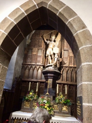 I stopped around the halfway point, told Joan I would wait if she wanted to do the top but she decided lunch was the priority. We took a different path down, through a cemetery and the chapel of St Michael (St Michel who the mountain is named for). There was a sculpt of Saint Michael slaying the dragon, and another Saint Joan