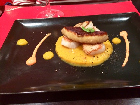 Joan had sea scallops and a slice of seared foie gras on a puree of butternut squash