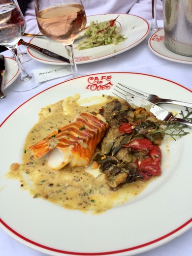 which is the name of Monique’s restaurant in Quebec - we were going to eat there but it was way too hot, so we found an outside cafe and dared the rain to come back. Started with a half dozen oyters (raw), Joan had a salad and a croque, a grilled cheese sandwich with ham in the middle. I had the plat du Jour- smoked cod (we eat cod all the time, never had it smoked) with ratatouille and a cream sauce with a touch of curry and cardamon seeds