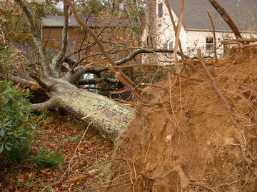 (it had the good graces to fall between the house and the garage). Out front a pine of similar height forked about half-way up; one fork snapped off tangling in some power/data lines.