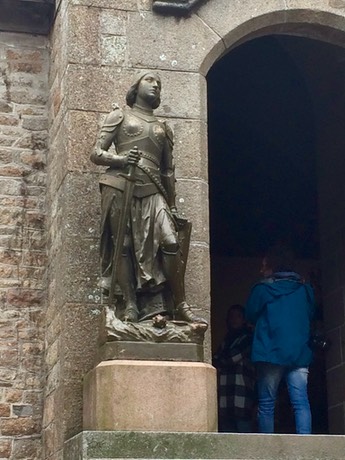 I stopped around the halfway point, told Joan I would wait if she wanted to do the top but she decided lunch was the priority. We took a different path down, through a cemetery and the chapel of St Michael (St Michel who the mountain is named for). There was a sculpt of Saint Michael slaying the dragon, and another Saint Joan