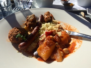 The Germans must have thought it strategic during WWII and set up here - so the Allies bombed the city to destruction. Which means the city was rebuilt from the ground up, all brand new. At a restaurant at the port we both had the traditional fish soup served with croutons, shredded gruyere cheese and aloi, a spicy garlic paste. Then I went overboard and had Couscous Royale: a huge bowl of couscous, a huge bowl of vegetable stew, and a platter of meat (lamb meatballs, merguez sausages, roasted chicken, and a little roast lamb). Took me 3 helpings to finish it all