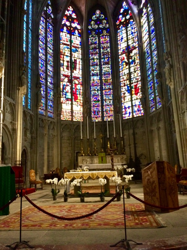 We were running low on gas and we knew Nantes was a place worth stopping, and it was about mid-way to St Malo so we exited the highway and drove into town. Like all large cities - difficult to get anywhere if you don’t know your way around. One advantage in France, look for the cathedral, usually the tallest thing around, and head for that. Dropped Joan off in front of the cathedral and set off looking for somewhere to park. Inside a really cool tomb for Francois the second but I left the phone in the car so no picture. Most old cathedrals are kind of grey and dingy (although that gives them character - centuries of candles and incense) - this one was a testament to light, the stone almost white and the stained glass windows glistening