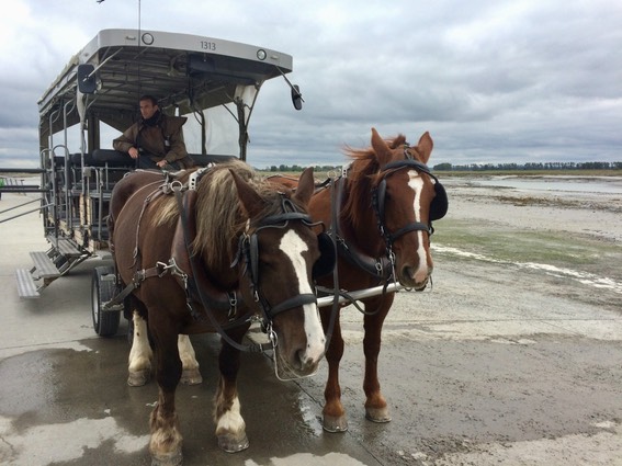 Lunch started with raw oysters of course, Joan had a brunch crepe stuffed with ham, eggs, and cheese. From the restaurants windows we could see flocks of sheep grazzing on the salt marshes along the coast. The famous sheep are very tender and have a natural salty-ness. That was my lunch, roast leg of lamb. Sorbet, Calvados, and coffees - then the long walk back down. We had noticed that the horse drawn carriages got much closer to the town walls than the free shuttle, so I paid the 20 euro and we had a very nice slow ride back to the parking lots.