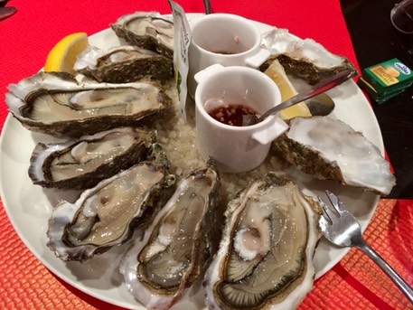 out on the hotel patio had a drink and the waitress brought us a piece of cake, still warm, made from seaweed, very interesting. Inside for dinner we started with a platter of oysters of course - huge and meaty